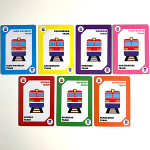The Train Game® is a fast-paced, 'take that!' style game based on the Melbourne train network. The goal is to collect a full hand of train stations from the same train line and the correct train card to go with them.